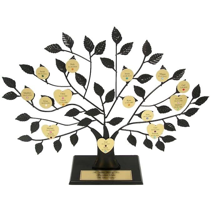This unique and personalized family tree from LoveIsARose.com has a gold plate and can feature 3 lines of text, including family names and special occasions. You can include the birthstones of the children and grandchildren with a disk for each family member. You can add new family members easily without any hassle.