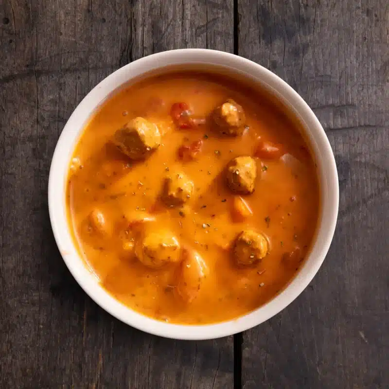 A seriously thick and textured soup packed with pork and beef meatball deliciousness in a creamy, sweet red pepper and grass-fed beef bone broth base.