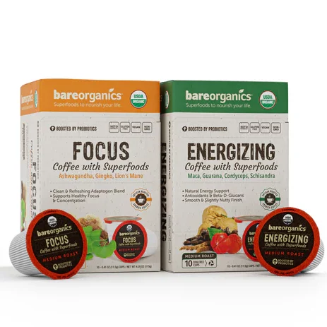 Bare Organics is a health-focused brand that offers a variety of organic products. Their Organic Focus & Energizing Coffee Bundle combines the benefits of two unique coffee blends. The “Focus” blend is designed to enhance concentration with ingredients like Lion’s Mane and Ashwagandha, while the “Energizing” blend provides a natural boost with Maca and Guarana. Both blends are made with organic Arabica beans and are compatible with most single-serve brewing systems.