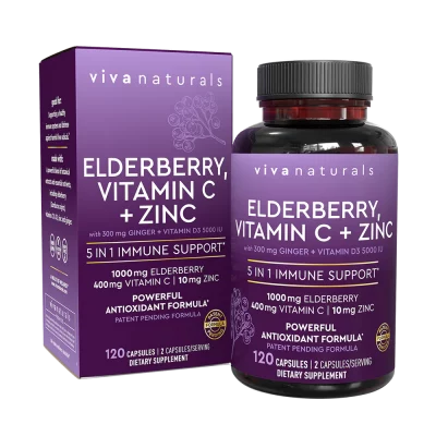Viva Naturals Elderberry, Vitamin C + Zinc supplements combine the power of nature and science to provide optimal immune support. This meticulously crafted formula is designed to boost your body’s defenses and help you maintain overall wellness.